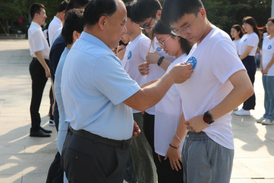 领导老师为毕业生党员佩戴党员徽章,激励毕业生党员亮身份、守初心、强党性、当先锋,牢记时代使命,积极投身建设中国特色社会主义事业。随后毕业生老党员为新发展党员佩戴党员徽章,表达了对新党员的鞭策和激励,体现出党员形象与责任的“传承”。在毕业班辅导员满灏同志的带领下,全体党员面向党旗,昂首挺立,高举右手,庄严宣誓,表达了对党的忠诚、对人民的热爱以及对社会主义事业的坚定信仰,以实际行动诠释共产党员的责任与担当。