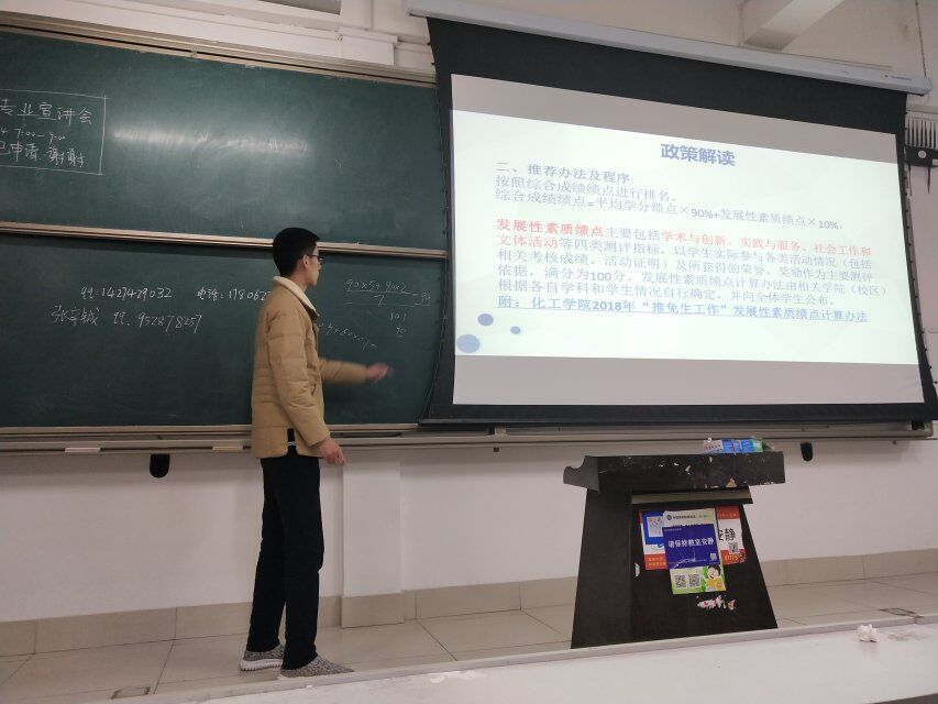 应化15-2班高雨靖同学分享了自己在学习习惯、学习规划上的经验,强调要有自己的学习方法,劳逸结合;矿加15-2班杨青同学分享了自己参加全国大学生英语竞赛、数学建模大赛的经验和成功,鼓励大家积极参与相关学科竞赛,在自身优势学科上取得优异成绩;工艺15-2班夏明锦同学对专利申请进行了详细的讲解,让同学们了解专利申请的流程和注意事项;环科15班段良凤同学对保外(夏令营)相关事宜及信息资料的来源给出了建议;工艺15-1班张辛铖同学对学校保研政策进行了详细解读,让同学们认识保研,了解保研。