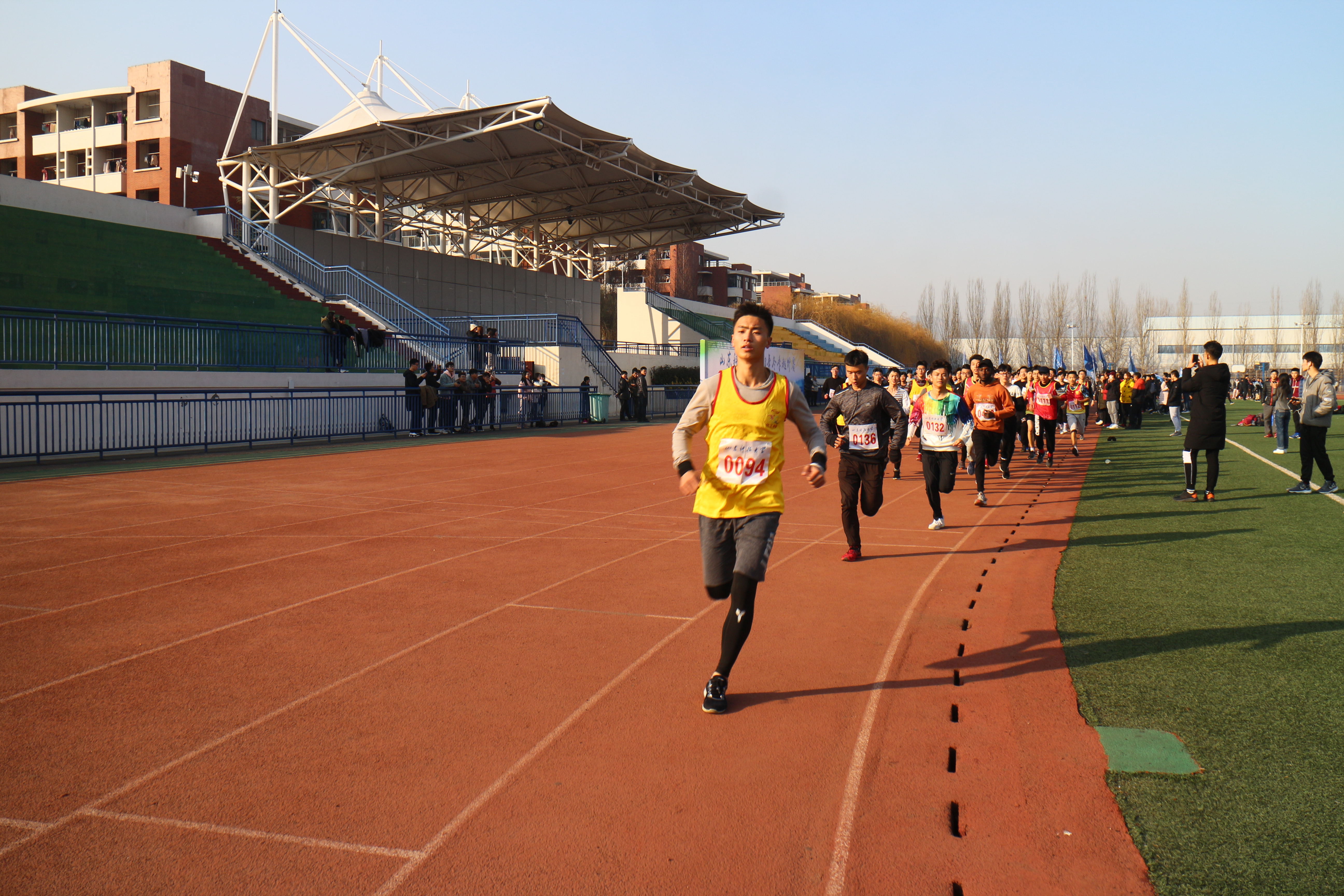 共计三百余名选手参加,比赛分为男子组和女子组。女子组于14点15分在跑道100米起点处率先出发,十五分钟后男子组开跑。女子组将绕校园一圈,赛程共计五千米;男子组将绕校园两圈,赛程共计一万米。