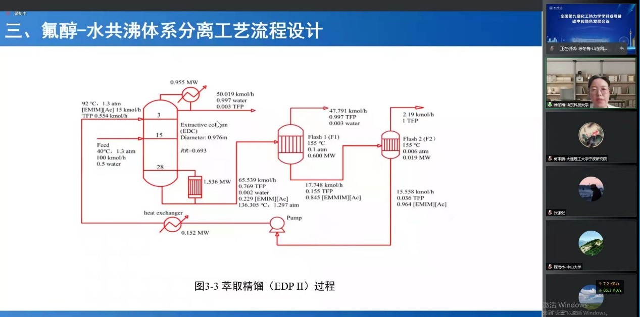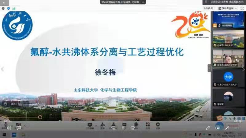 2021年10月21-23日,“全国第九届化工热力学学科发展暨碳中和绿色发展会议”成功举办。中国化工学会离子液体专业委员会委员、我校徐冬梅教授应邀做了题为《氟醇-水共沸体系分离与工艺过程优化》的大会报告,与参会的500多位专家学者分享了基于离子液体为萃取溶剂在氟醇-水共沸体系分离领域所做出的前瞻性研究和相关成果,取得了良好的交流效果。