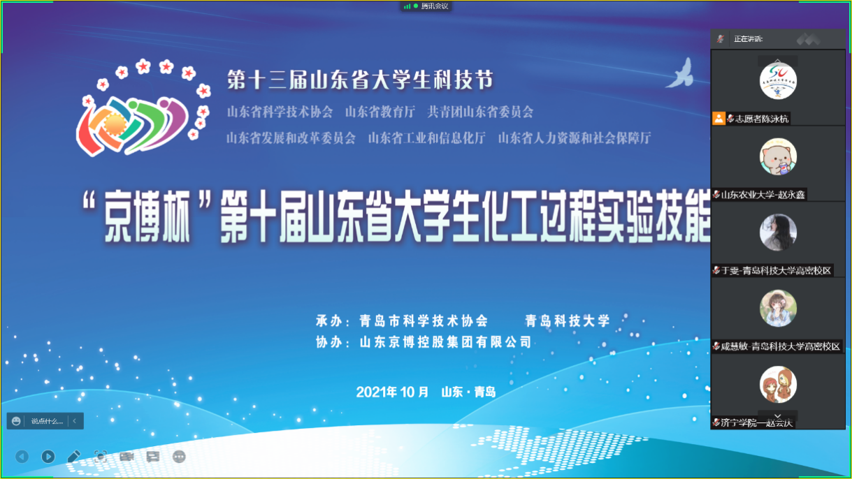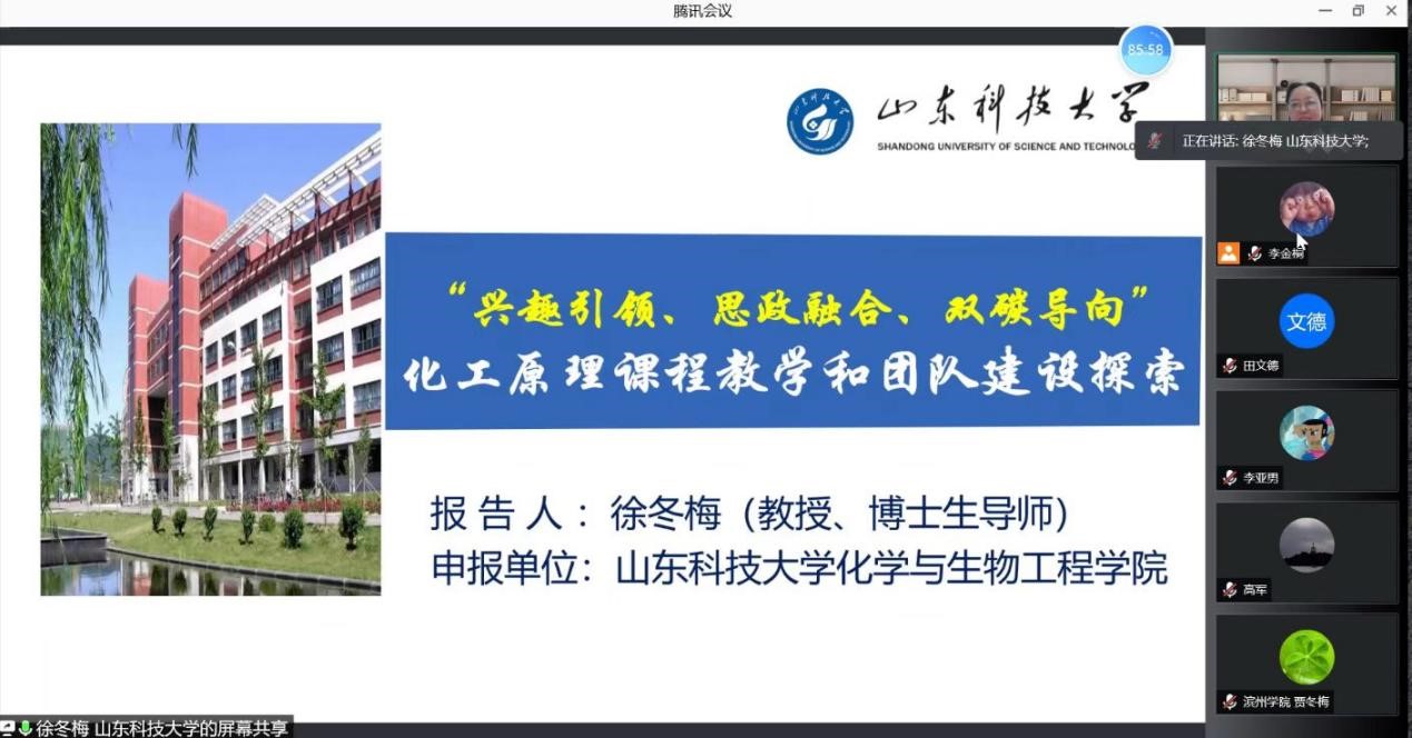 在竞赛期间,由山东省大学生化工过程实验技能竞赛委员会、化工过程国家级实验教学示范中心(青岛科技大学)联合主办的“全省化工专业一流课程线上教学研讨会”在10月31日下午召开。受组委会邀请,91pro徐冬梅教授在会议上作了题为“兴趣引领、思政融合、双碳导向”化工原理课程教学和团队建设探索的一流课程建设专题报告,和参会的50多位专家分享了我校在化工原理课程和一流课程建设方面的成果和经验,取得了良好的交流效果。