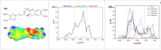 图1 (a-c) RA的 (a)化学结构式;(b) 表面电荷密度(σ-surface);(c) 表面电荷分布图(σ-profile);(d) 不同溶剂与RA的表面电荷分布图