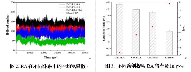 本研究以迷迭香为原料,对三种基于氯化胆碱的NADESs以及传统溶剂乙醇提取RA进行研究,旨在寻求RA的NADES高效提取溶剂及最优条件。采用基于COSMO-SAC模型的量子化学计算及分子动力学模拟等手段,对绿色NADESs固-液提取RA的机理进行研究,进一步结合提取实验确定RA提取所用较优溶剂。在所考察的四组溶剂中,RA在体系中无限稀释活度系数 (γ∞)越小、总的非键相互作用能越强、氢键数越多,以及体系各组分间的自扩散系数偏差越小等,均与溶剂提取RA的效果呈正相关。结合实验确定氯化胆碱/乳酸(ChCl/LA)为提取RA的最优溶剂,进一步对其提取条件进行响应面法优化,所得RA提取率可显著提高至6.10%。本研究表明NADESs作为一种高效提取RA的新型绿色溶剂,可替代传统的有机溶剂。结合分子模拟与实验的多尺度机理探讨,可为其它提取过程的研究提供参考,进而促进各类天然产物提取溶剂的高通量筛选及设计、推进NADESs作为一种高效溶剂用于我国丰富的药材资源中各类天然活性成分的提取。后续拟对NADESs的回收再利用、RA的进一步分离纯化及药效评价等展开深入研究。