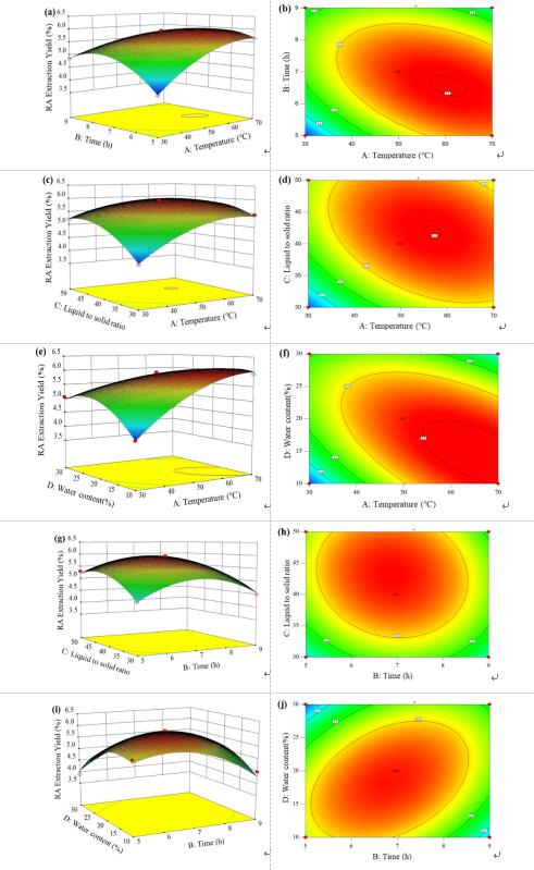 图4. 不同变量对RA提取率的影响:三维图 (左) 以及等高面图 (右). (a), (b) 提取温度与时间;(c), (d) 温度与液料比;(e), (f) 温度与水含量;(g), (h) 时间与液料比;(i), (j) 时间与水含量