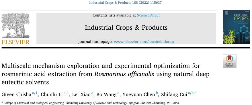 王博教授课题组崔志芳副教授在天然酚类化合物的绿色分离及相关机理探讨领域取得了新进展。相关成果以“Multiscale mechanism exploration and experimental optimization for rosmarinic acid extraction from Rosmarinus officinalis using natural deep eutectic solvents”为题发表在国际知名学术期刊Industrial Crops & Products上(Top期刊,中科院分区1区)。