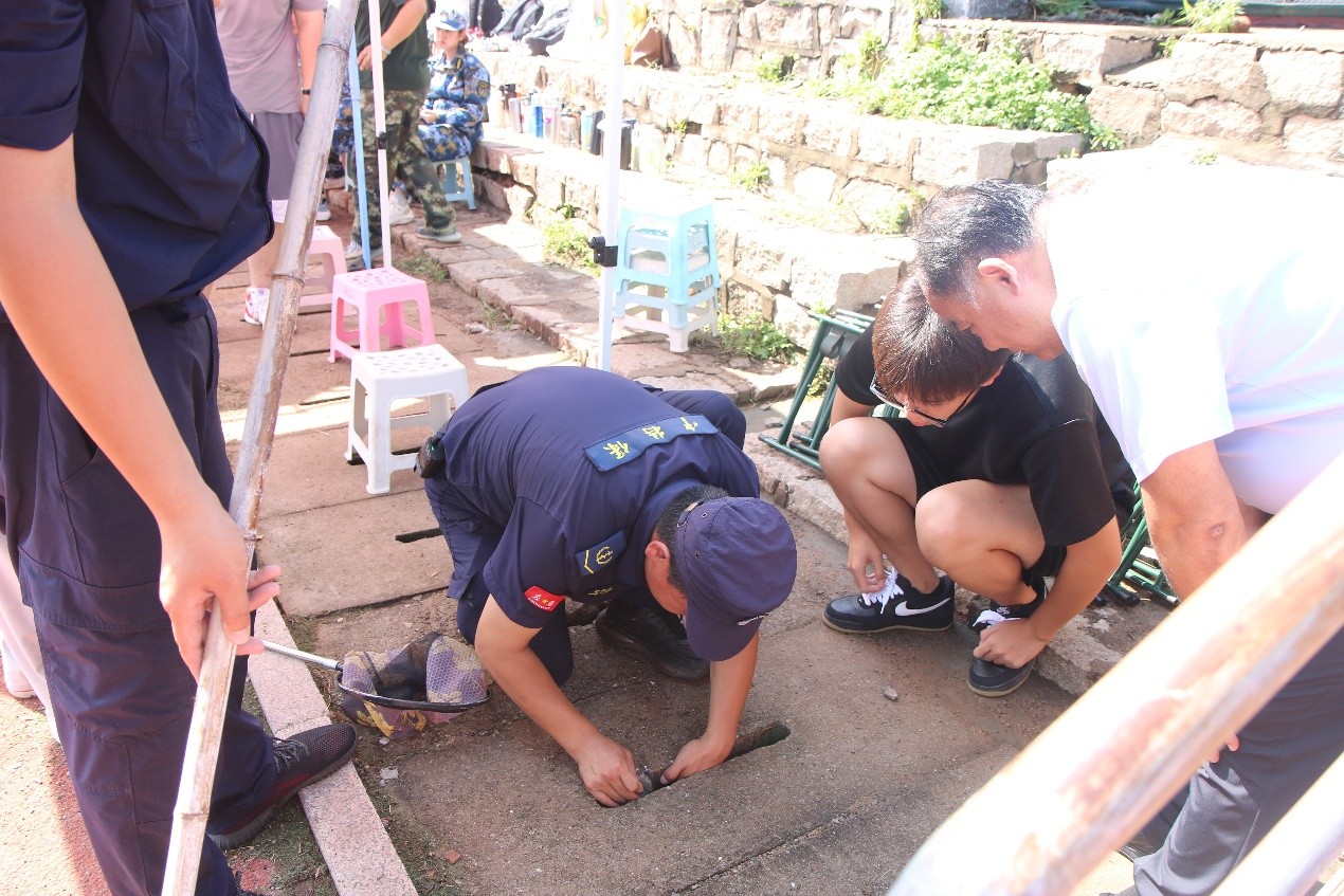 领导统筹协调、学校多部门联动配合的暖心打捞行动随即进行。新生辅导员李玲玲老师第一时间安抚新生,现场的学生兼职辅导员立即自制工具进行打捞,但因缝隙狭窄、深度较大,多次尝试未能成功。