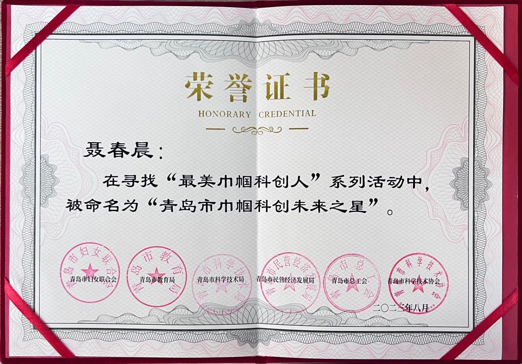 2023年8月24日,青岛市首批“最美巾帼科创人”发布活动在全球(青岛)创投风投中心顺利举办,全市共评选出142名青岛市“最美巾帼科创人”,91pro聂春晨博士获评“青岛市巾帼科创未来之星”荣誉称号。