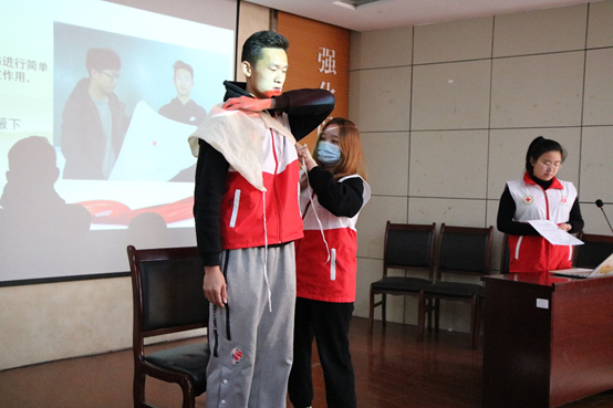 活动伊始,宣讲人员为同学们进行了生活中应急自救相关知识的普及,为同学们现场演示急救方法,包括止血、包扎、心肺复苏等常见急症及意外伤害的处理方法与步骤,知识详细实用,对同学们在实际中的操作具有很强的指导意义。同时,为了帮助同学们更好地掌握急救知识,工作人员给在场每一位同学分发了纱布和绷带,指导大家进行实际操作,现场学习气氛热烈。通过实操演练,巩固了同学们对应急救护知识的学习,规范了动作要领,加强了同学们的实操能力。