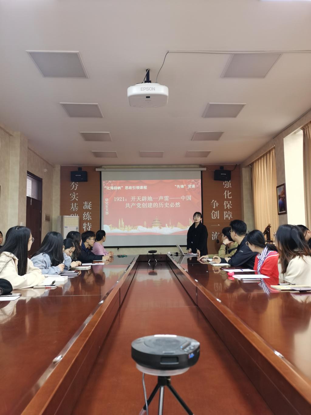 研究生党支部“先锋”党课进行第三讲。王振冬同志担任主讲,党课的主题为“开天辟地一声雷——中国共产党创建的历史”。支部全体党员到场聆听。课堂上,王振冬从近代中国一系列革命的失败讲起,谈到受俄国十月革命和马克思主义传播的的启发,再到五四运动激励,促使以中国工人阶级和知识分子为代表的近代中国人民全面觉醒,寻求救亡图存的艰难历史,全面讲述了中国共产党成立的历史必然性。她说,中国共产党的成立,是开天辟地的大事变,中国革命的面貌、中华民族的面貌、中国社会的面貌,由此焕然一新。课程结束后,党支部书记易凡老师与各位同志交流学习心得。她强调,作为一名共产党员,我们要进一步传承和弘扬“红船精神”,坚定共产主义信仰,以永无止境的追求、善谋新篇的担当,继续干在实处、走在前列,为中国人民谋福利做贡献。