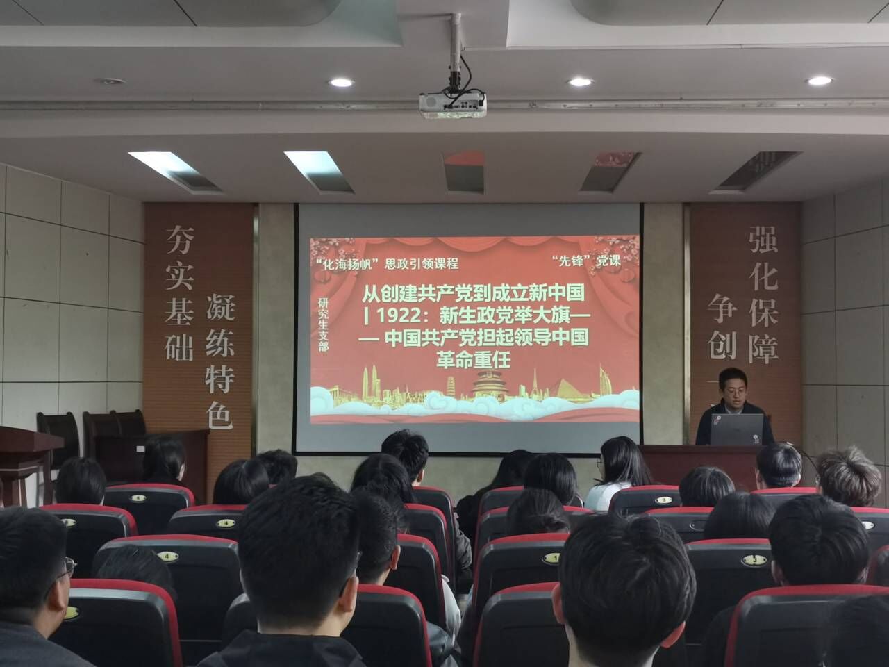 研究生党支部“先锋”党课进行第四讲。武博文同志担任主讲,党课的主题为“新生政党举大旗——中国共产党担起领导中国革命重任”。支部全体党员到场聆听。课堂上,武博文向大家讲述了,1921年7月,中国共产党成立,随后短短一年的时间,年轻的中国共产党茁壮成长,给中国革命带来新的希望。他说,中国共产党在理论上和实践中展现出自己的先进性,把马克思主义基本原理与中国革命具体问题相结合,在科学分析国际国内形势的基础上,明确革命的对象和动力,制定了民主革命的纲领,破天荒地在全中国人民面前举起反帝反封建的旗帜。中国共产党以中国工人阶级先锋队和中国人民根本利益代表者的面貌,组织和掀起工人运动的高潮,发动和领导农民运动、青年运动、妇女运动,很快开创出中国革命的新局面。课程结束后,党支部书记易凡老师与各位同志交流学习心得。她强调,作为一名共产党员,我们要认真学习和传承党史,使之内化于心,外化于行,这样才能进一步增强道路自信、理论自信、制度自信和文化自信,坚定不移地推进中国特色社会主义伟大事业。