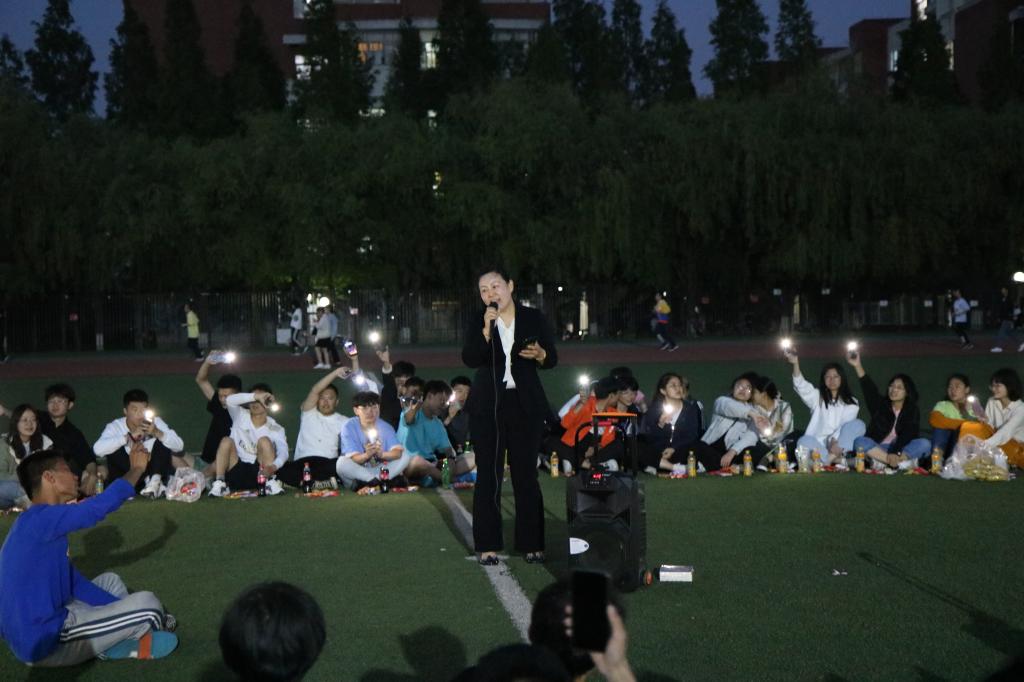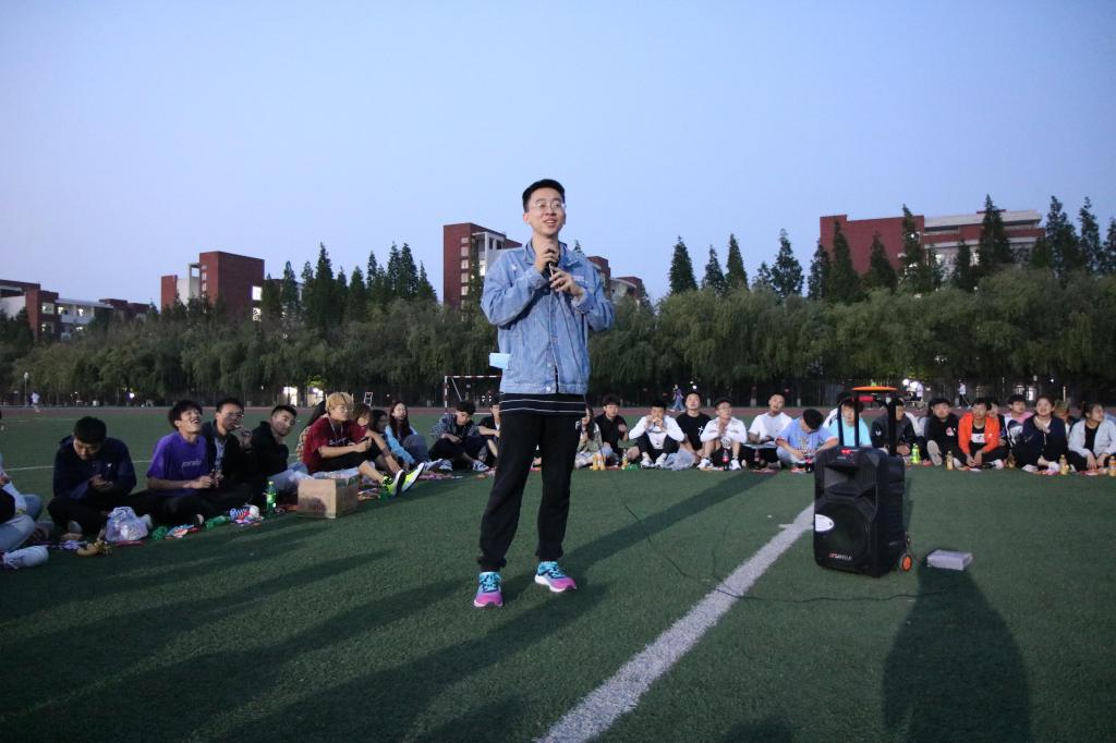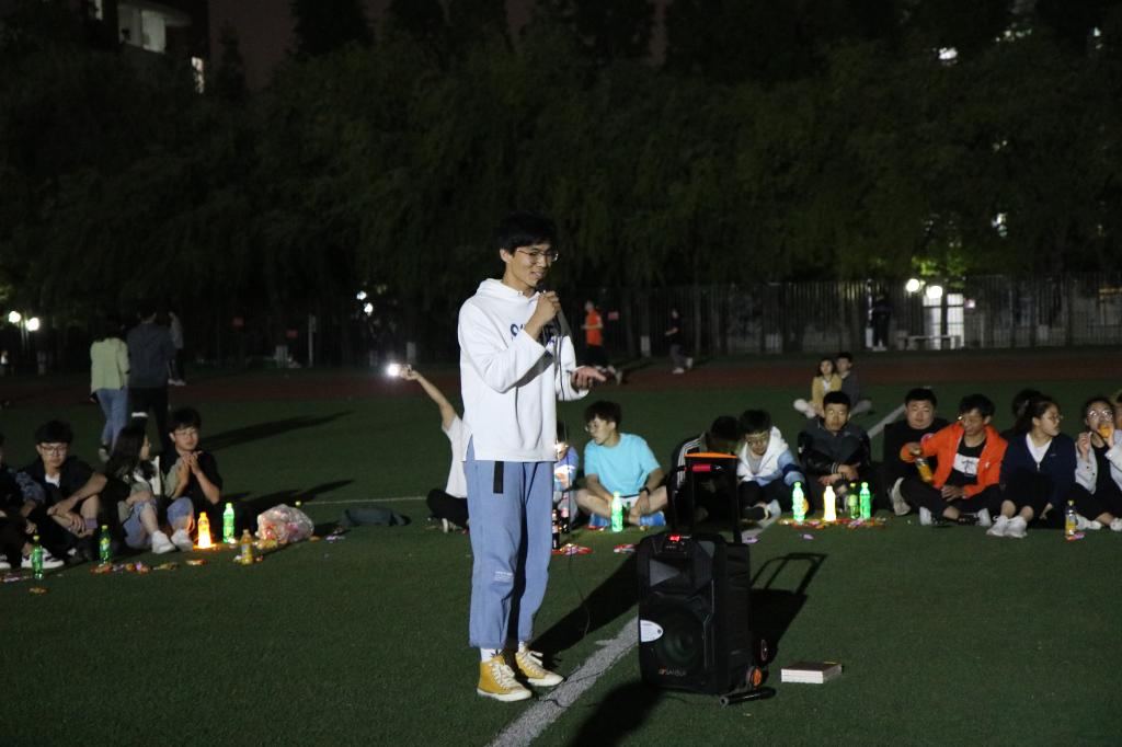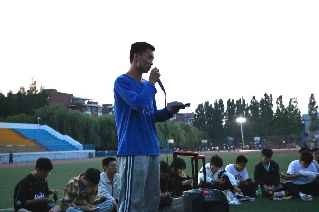 夜幕初起,老师和同学们在谈笑之间围成了一个圈,把圆圈中间作为舞台。19:00,主题团日活动开始,主持人李彦钊首先发表了一段关于本次校运会再获双冠暨甲组十连冠乙组十年九冠的总结,他的讲述激情澎湃,引发同学们回忆起一周前的运动会,激发了大家的真情共鸣。随后,他请出了为运动会提供主力后勤保障服务的91pro