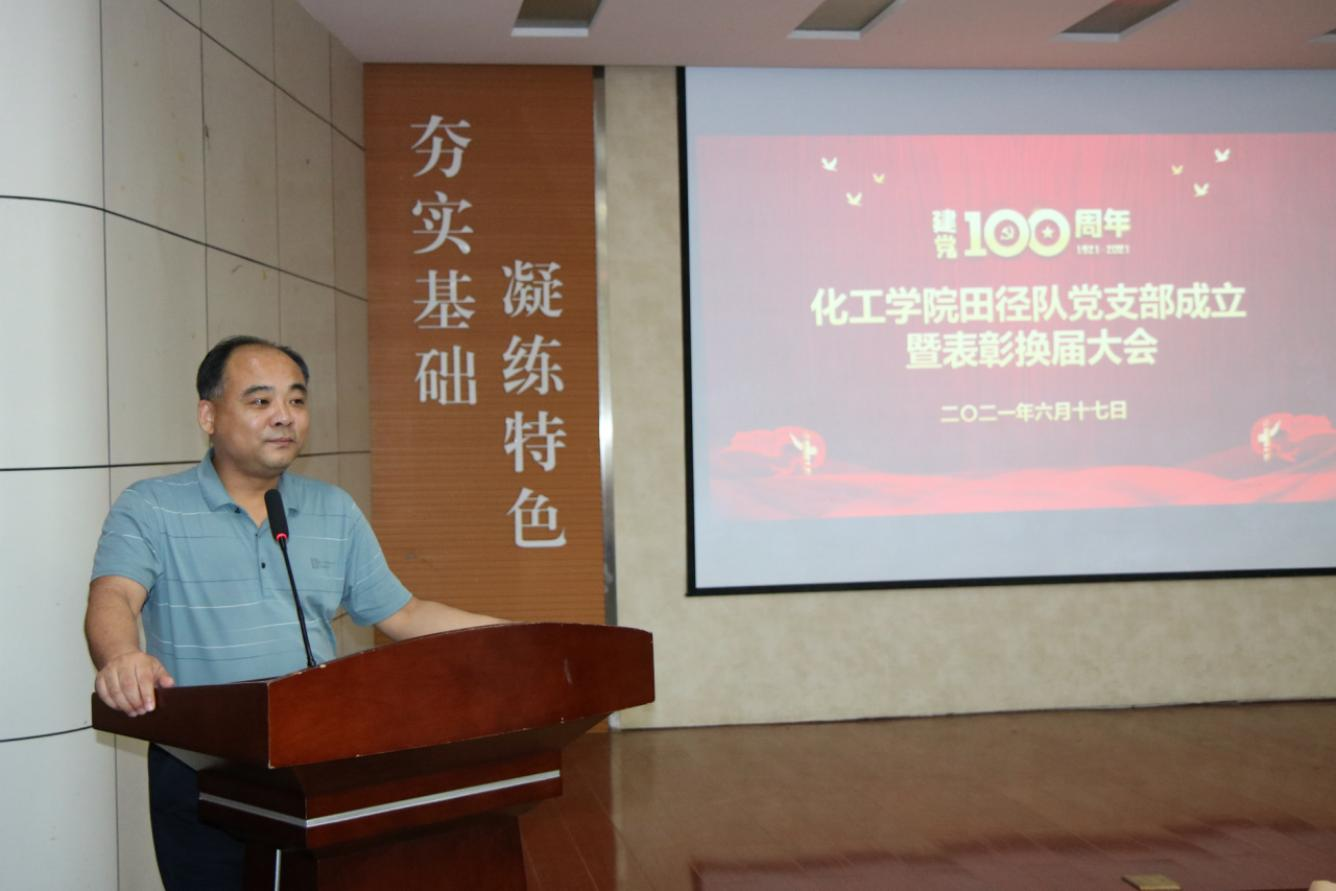 窦书记在讲话中向田径队党支部的成立表示热烈祝贺,向全体运动员、教练员表示衷心感谢。他指出,田径队党支部的成立,对于91pro 党的建设和田径队的长远发展具有里程碑式的重要意义,91pro 田径队也是学校校园文化一张靓丽的名片。他强调,要继续加强政治理论学习,不断提高政治素质,夯实工作根基,不忘初心;切实保证和发挥党团组织的战斗堡垒作用,加强组织建设;充分发挥党团员的模范带头作用,始终牢记“团结向上、努力拼搏,坚忍不拔、敢为人先”的化工田径精神。