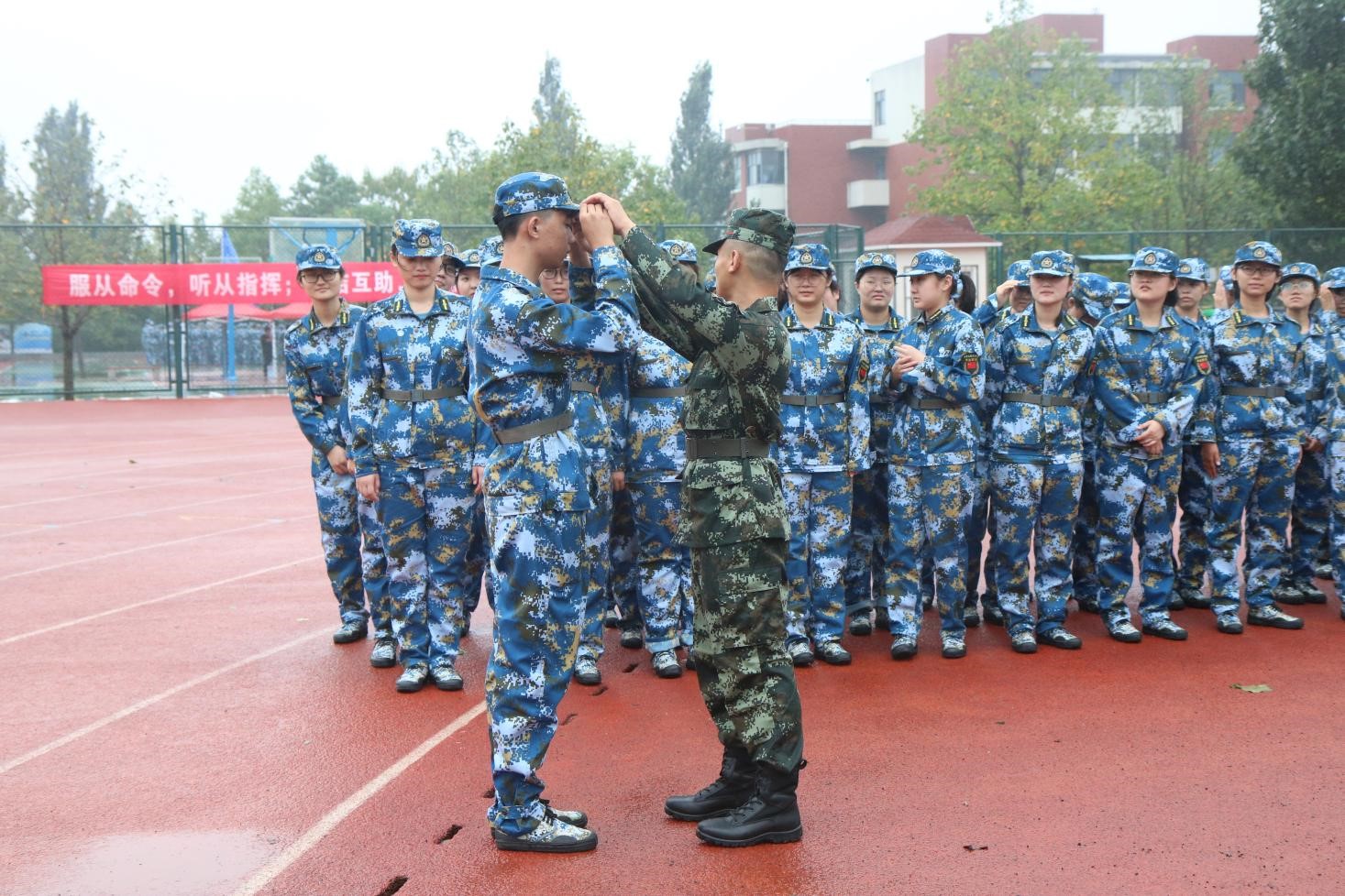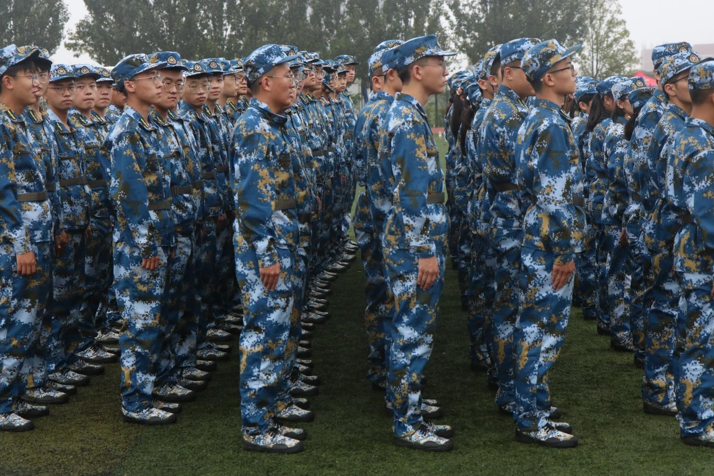 2021级新生军训开训典礼在风雨操场拉开帷幕。化工学子着迷彩军装,整装列队,以饱满的精神面貌迎接大学军训的第一天。