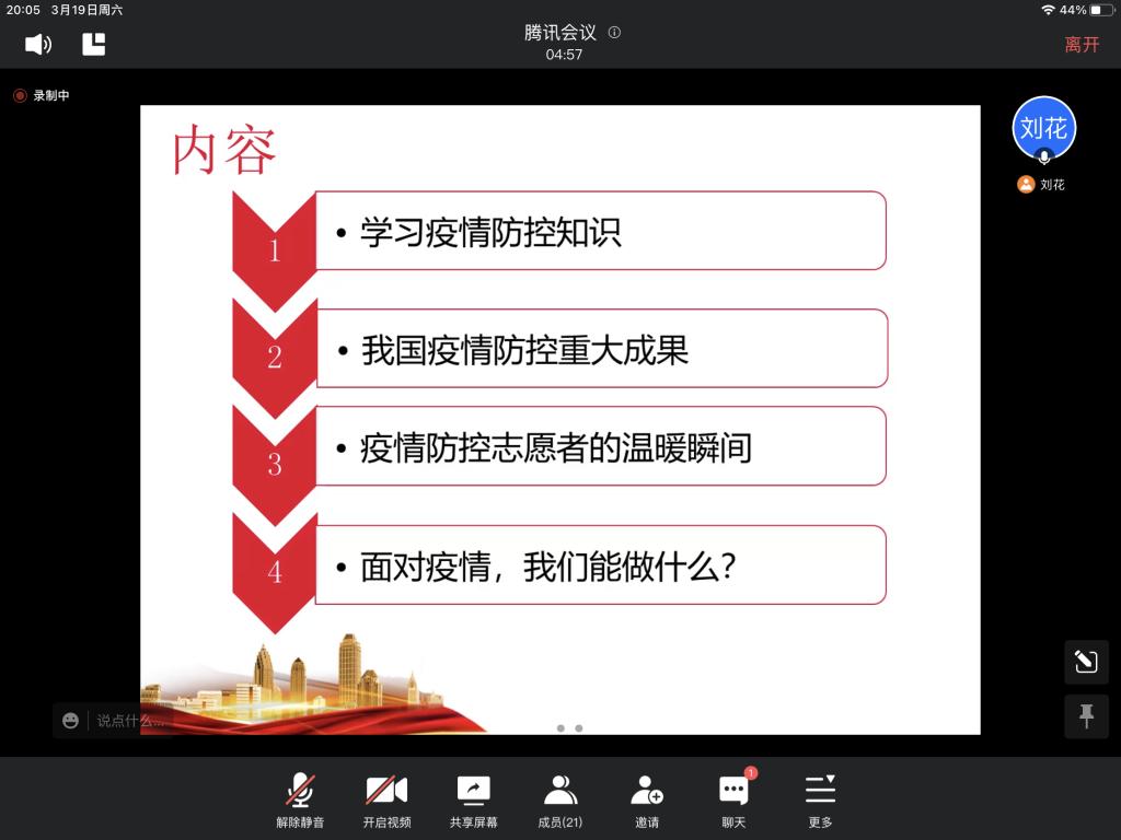 此次活动以调节同学们对待疫情的心态为切入点,结合实例,呼吁同学们正视疫情,积极服从学校的相关防疫安排。同学们积极连麦,主动分享自己在抗疫期间的心得与感受,格外鼓舞了大家对疫情阴霾终将散去、疫情终将被战胜的必胜决心,点燃了同学们积极抗疫的热情,传递了正能量。同学们在班会中更加明确了学习的重要性,即使在网课期间,也要学会合理安排时间,不能放松学习。
