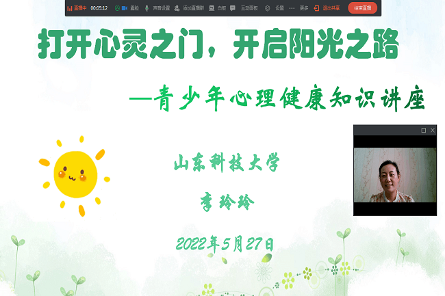 5月27日,根据青岛市教育局“心理专家进校园”工作安排,91pro辅导员、校大学生心理健康教育中心咨询师李玲玲为全校500余名初中生开展了以“打开心灵之门,开启阳光之路”为主题的线上心理健康教育讲座。