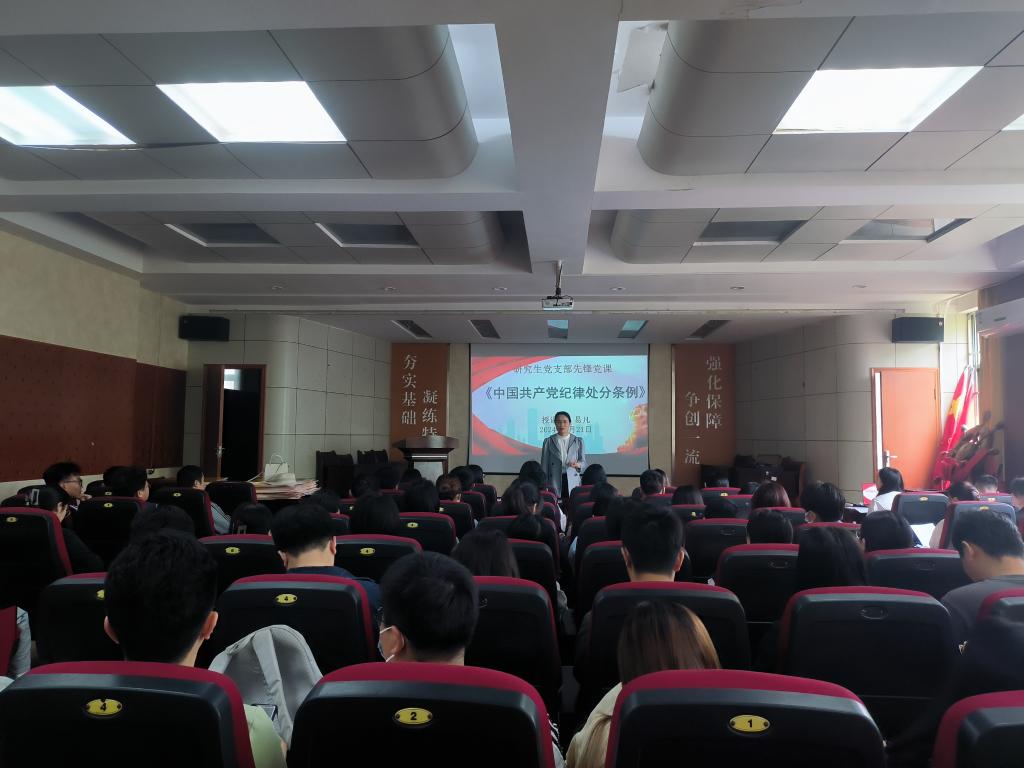 研究生党支部召开全体党员大会,会议由党支部书记易凡老师主持。会议一共有两个议题。首先,易凡老师带领与会党员同志学习了《中国共产党纪律处分条例》第一篇的相关内容。领学结束后,与会同志对于第一篇中的若干条款展开讨论,并表达了不忘初心遵守党纪的决心。接着,易凡老师布置了自主学习任务,要求全体党员自主学习第二篇相关内容。随后,易凡老师严格按照党员发展的程序,带领全体党员逐个讨论了贾玉琪、初颖、王晓靖、王志薇等四位同志的组织发展问题,具有投票权的59名正式党员经过无记名头片表决,全票通过,同意接收贾玉琪等四位同志为中共预备党员,易凡老师带领四名新党员进行了入党宣誓。最后,这次党员大会在欢迎新同志加入党组织的热烈掌声中结束。