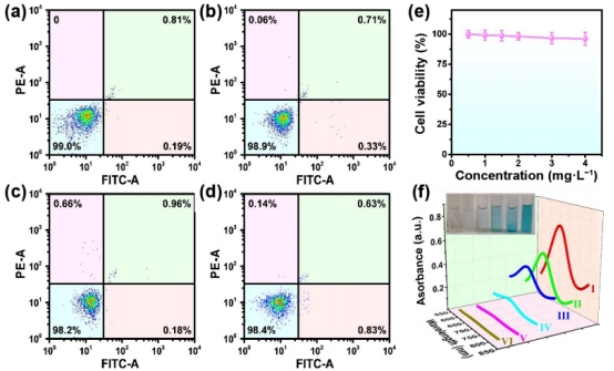 3 (a-d)流式细胞仪表征结果;(e)细胞毒性实验结果;(f)材料过氧化物模拟酶性能研究