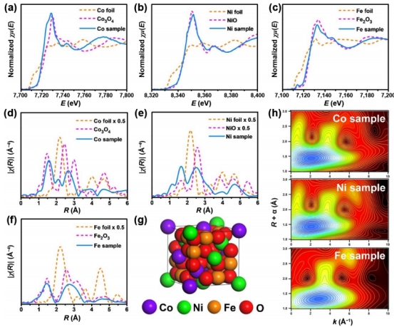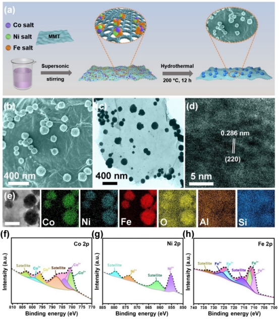 1 (a)材料合成机理图;(b)SEM图;(c)TEM图;(d)HRTEM图;(e)EDS-mapping图;(f-h)XPS谱图。