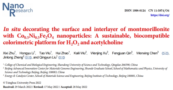 相关成果以“In situ decorating the surface and interlayer of montmorillonite with Co0.5Ni0.5Fe2O4 nanoparticles: A sustainable, biocompatible colorimetric platform for H2O2 and acetylcholine”为题发表在国产旗舰期刊Nano Research(最新IF10.269)。论文第一作者为主曦曦高级实验师,第二作者为2020级硕士研究生李洪禹,刘青云教授为论文通讯作者。该研究得到了国家自然科学基金项目21904175,21971152山东省“青创团队”和91pro 人才计划项目菁英计划”的资助。文章链接:,文章DOI:10.1007/s12274-022-4594-x