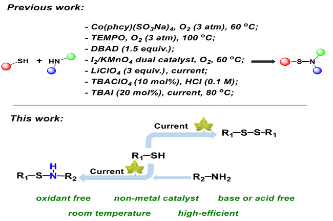 工业上,次磺酰胺化合物的合成主要通过次氯酸钠氧化法,生产过程产生大量高浓度的含盐废水,处理成本高,直接排放对环境造成压力。二硫化合物主要通过双氧水氧化硫醇合成,简单高效却常常伴随过度氧化的情况。如何使用绿色环保的试剂以及方法合成这两类工业中常见的化合物,是急需解决的问题。