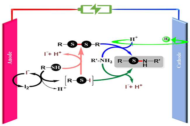 在阳极碳棒上,KI中的I-失电子,化学价升高被电极氧化为I2,生成的I2一方面可以氧化硫醇形成不稳定的[R-S-I]中间体,并与胺反应形成次磺酰胺化合物,这是主要的反应途径,也有一部分[R-S-I]中间体没有与胺反应,生成二硫化合物R-S-S-R,其在高浓度的胺与持续产生的I2溶液中不能稳定存在,继续转化为次磺酰胺化合物。在反应过程中,脱落下来的H+会移动到阴极得电子以H2的形式释放,而I-则会在阳极失电子,继续参与反应的进行。整个反应中的驱动力是电流,KI作为反应的“桥梁”使反应向正确的方向进行,得到的唯一副产物是氢气,原料几乎可以完全转化,因此是一种高效绿色的合成方法。因此,此反应进行的关键为碘元素在体系中的循环以及脱落的H+得电子生成氢气排出体系(图1)。