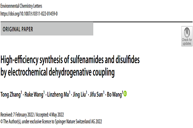 王博教授团队在次磺酰胺/二硫化合物的电化学脱氢偶联绿色催化领域取得了新进展。相关成果以“High‑efciency synthesis of sulfenamides and disulfdes by electrochemical dehydrogenative coupling”为题发表在国际知名学术期刊Environmental Chemistry Letters上(最新IF 13.615)。