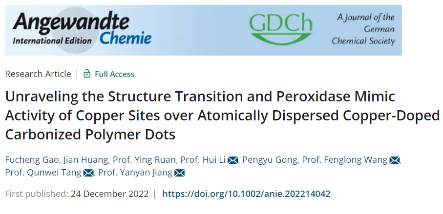 为通讯单位在材料和化学领域顶级刊物Angewandte Chemie International Edition上发表了题为“Unraveling the Structure Transition and Peroxidase Mimic Activity of Copper Sites Over Atomically Dispersed Copper-Doped Carbonized Polymer Dots”的研究论文。