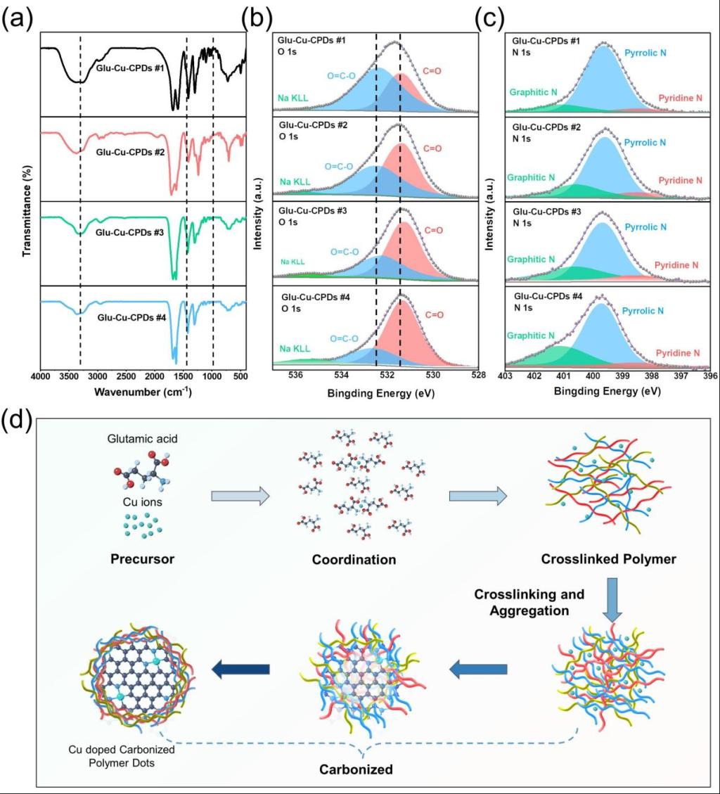 图2. Cu原子掺杂对CPDs表面活性基团的影响以及TMAs-doped-CPDs的形成机制。