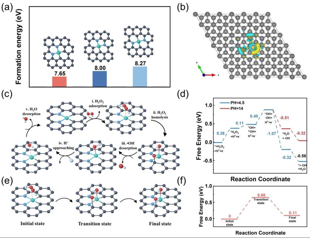 DFT计算揭示了Cu-N2C2结构催化H2O2的过程遵循双位点催化机制,即Cu原子以及与Cu原子临近的N原子旁的C原子都是活性位点。同时,作者还解释了pH与温度对催化过程的影响,并展示了3,3',5,5'-四甲基联苯胺 (用于测定酶活性的探针)参与的催化过程。这是首次对Cu-N2C2类芬顿效应的细致探究。