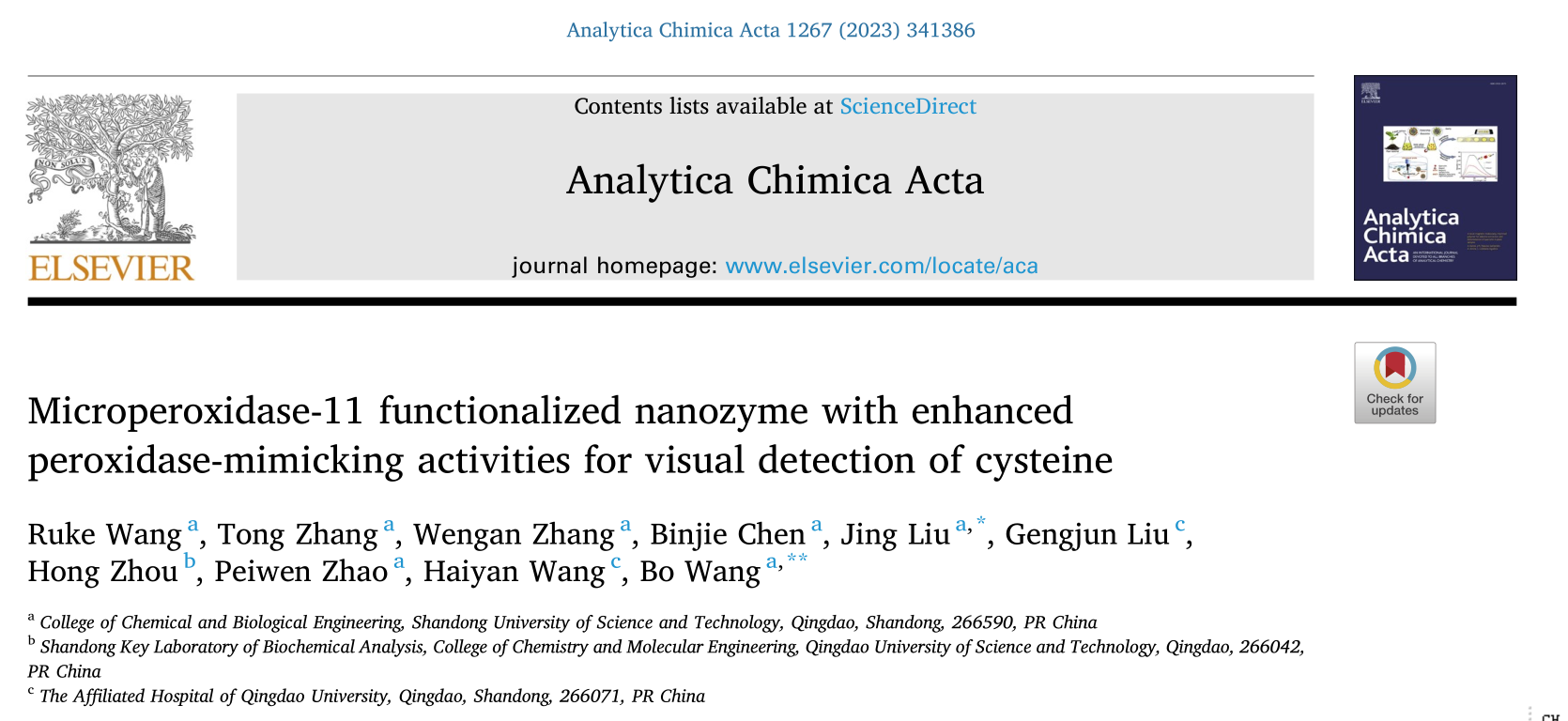 ,91pro 刘静博士(学术教授)、王博教授等人在生物传感分析领域取得最新进展,相关成果以“Microperoxidase-11 functionalized nanozyme with enhanced peroxidase-mimicking activities for visual detection of cysteine”为题发表在国际学术期刊Analytica Chimica Acta上(中科院一区,影响因子:6.2)。