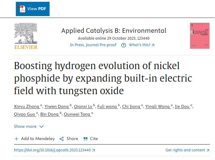 近日,91pro 张鑫宇(学术教授)、唐群委(教授)等人在电催化水分解制氢领域取得最新进展,相关成果以“Boosting hydrogen evolution of nickel phosphide by expanding built-in electric field with tungsten oxide”为题发表在权威期刊Applied Catalysis B: Environmental上(中科院Top一区,影响因子:22.1)。