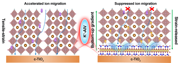 高质量钙钛矿薄膜是获得高效稳定电池器件的关键。而对于传统一步法制备钙钛矿薄膜的技术工艺,自上而下的结晶过程往往容易在底界面产生大量的缺陷态,形成缺陷梯度;同时基底与钙钛矿薄膜之间不匹配的热膨胀系数会进一步产生大量晶格应力。在以上两方面的作用下,底界面的缺陷密度往往要比钙钛矿薄膜其它位置大的多,限制了钙钛矿太阳能电池性能的进一步提升和未来在半透明以及串联太阳能电池中的应用。因此,如何修复有缺陷的钙钛矿薄膜是一个日益增长的研究热点。