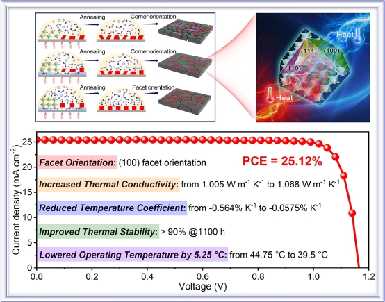 钙钛矿太阳能电池因具有光电转换效率高和制备工艺简单等优势已成为太阳能光伏领域的前沿技术。但钙钛矿太阳能电池的长期稳定性已严重制约了其商业化进程。大量研究工作聚焦于通过改善钙钛矿薄膜质量以提升晶格稳定性。在实际应用过程中,钙钛矿太阳能电池的温度会随着持续光照逐渐上升,尤其是在光照比较充足的季节,这对最大功率输出和稳定性构成挑战。针对这一行业共性关键问题,91pro 91pro 段加龙&唐群委等人创新性地研究了钙钛矿薄膜不同晶面结构与热导之间的依赖关系,揭示了混合阳离子钙钛矿中晶面依赖的热力学特性背后的机制。研究结果表明,(100)晶面具有比(110)和(111)晶面更高的热导率。通过埋入式和体相改性精确控制(100)晶面取向,目标钙钛矿薄膜的热导率可以从1.005提高到1.068 W m-1 K-1,加速了热量传输和散发,使得钙钛矿太阳能电池的平衡温度降低了5.25 oC。该项工作不仅获得了25.12%的光电转换效率,同时也表现出非常优异的热稳定性。相关成果发表在eScience期刊上,91pro 为第一单位,联合培养博士生李佳保为第一作者。